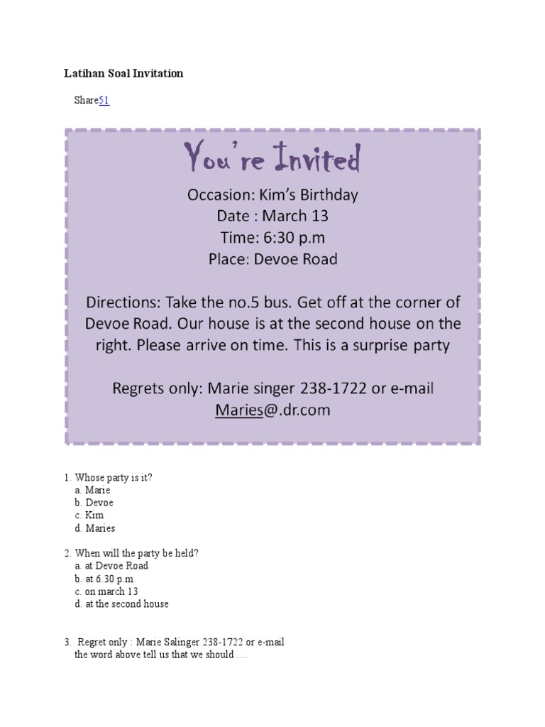 Soal Invitation - Soal Invitation Text Jawaban Youth Pledge Day Englishahkam : 0 save share copy and edit edit.. Will come to the movie 15. Contoh soal berikut adalah paket soal yang merupakan gabungan beberapa soal yang telah diambil dari berbagai materi seperti hobby and interest, question tag, adjectives, reading number, relative pronoun, invitation, compliment, agreement and disagreement. Semoga dapat membantu kalian dalam pembelajaran bahasa inggris di sekolah! Dalam artikel ini saya akan membagikan 10 contoh soal invitation card dan kunci jawaban terbaru untuk pelajar sekolah menengah pertama kelas 7, 8 atau 9 smp/mts. Read the following text to answer questions number 1 and 2.